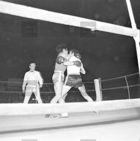 N/z mecz bokserski w trakcie mistrzostw. Po lewej w białej koszuli stoi sędzia.