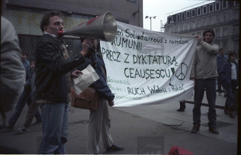 Wrocław 15-11-1988, ul. Świdnicka. Akcja protestacyjna Ruchu Wolność i Pokój i SPCz z okazji Międzynarodowego Dnia Solidarności z Narodami Rumuni. N/z: Marek Krukowski, Jerzy Żurko, Radosław Gawlik. Fot. NAF Dementi