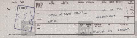 Bilet na pociąg pośpieszny (klasa 2) na trasie Kielce - Warszawa Wschodnia.