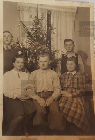 Boże Narodzenie podczas robót przymusowych w Niemczech. Pierwsza w lewej siedzi Stefania Idasiak z domu Rodak, za nią stoi Kazimierz Idasiak, przyszły mąż. Lata czterdzieste, Niemcy.