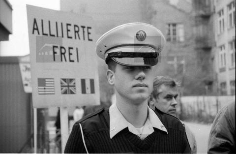 Berlin, 11-11-1989. Punkt kontroli granicznej w Berlinie, tzw. Checkpoint Charlie, przejście graniczne między RFN a NRD. N/z żołnierz amerykański, Military Police (MP). Fot. NAF Dementi
