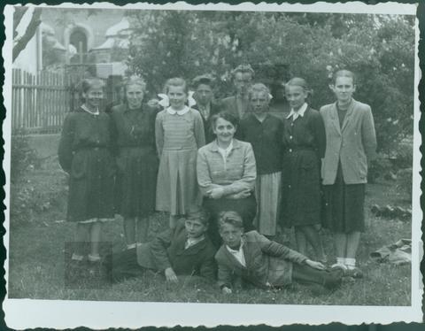 Kierowniczka szkoły, Stanisława Siekańska z uczniami szkoły podstawowej w Zwróconej, zakończenie roku szkolnego, lata 50. XX w. W tle widoczny kościoł parafialny pw. św. Apostołów Piotra i Pawła w Zwróconej.