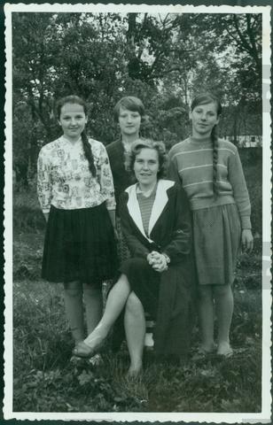 Nauczycielka Teresa Gabrysz z uczniami ze szkoły podstawowej w Zwróconej, zakończenie roku szkolnego 1961/1962.