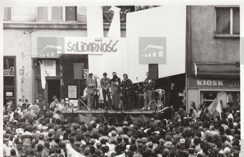 Wiec wyborczy Solidarności na Rynku w Świdnicy, 1 maja 1989. Scena stoi przed wejściem do lokalnego Biura Komitetu Obywatelskiego "Solidarność". Na scenie stoją, od prawej, kandydaci Solidarności do Sejmu i Senatu: Mieczysław Tarnowski (2.), Marian Kowal (3., za kobietą), Jan Lityński (5.), Włodzmierz Bojarski (6., ostatni).
