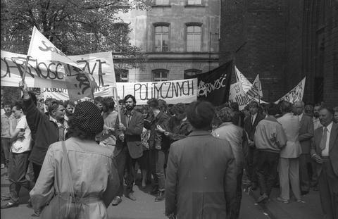 Wrocław, 01-05-1988. Plac przed kościołem św. Stanisława, św. Doroty, św. Wacława. Manifestacja z okazji święta ludzi pracy zorganizowana przez opozycję, min.: Solidarność, Niezależne Zrzeszenie Studentów i Ruch Wolność i Pokój.