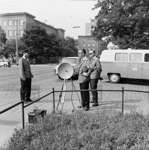 Wrocławscy milicjanci podczas radarowej kontroli prędkości na ulicy Jedności Narodowej.