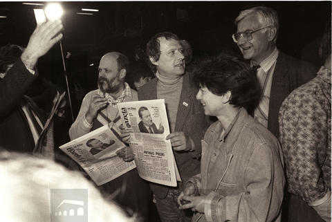 Warszawa, 08-05-1989 (do 27-12-1987) Druk pierwszego numeru Gazety Wyborczej. N/z w środku od lewej Ernest Skalski, Adam Michnik, Helena Łuczywo. Fot. NAF Dementi