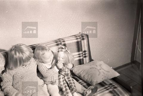 Dzieci na kanapie. Od lewej Monika Kobylańska i Katarzyna Kobylańska. Wrocław, Oporów