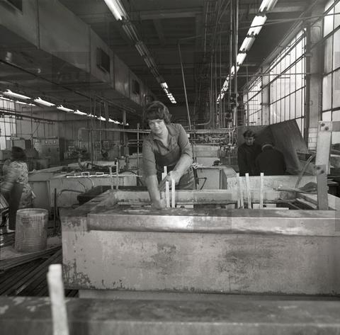 N/z wnętrze galwanizerni i pracownica przy wannie galwanicznej.