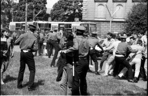 Warszawa, 23-05-1989. Ambasada Chińskiej Republiki Ludowej, brutalna interwencja milicji wobec uczestników protestu (WiP i Partia Radykalna) przeciwko władzom Chin, które wprowadziły w Pekinie stan wojenny w związku z protestami studentów na placu Tiananmen. Fot. NAF Dementi