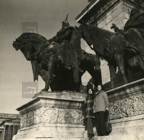 Widok na fragment XIX-wiecznego pomnika znajdującego się na Placu Bohaterów. Pod rzeźbą króla Arpada stoi Janina Piotrowska (z lewej) z koleżanką.