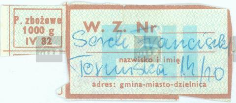 Kartka reglamentacyjna, na tle nadruku: PII napis W. Z. Nr w polu: nazwisko i imię adres: gmina-miasto-dzielnica Serek Franciszek Toruńska 14/10 na odwrocie częściowo widoczna pieczęć tekstowa, tusz czerwony, Przedsiębiorstwa Gospodarki Komunalnej i Mieszkaniowej (Zakład Gospodarki Mieszkaniowej) z Inowrocławia; zachowany kupon na p. zbożowe (1000 g)