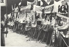 Transparenty opozycyjne i religijne przy murze klasztoru jasnogórskiego podczas V Pieszej Pielgrzymki Wrocławskiej na Jasną Górę.