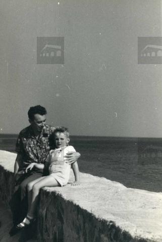 Mieczysław Piotrowski siedzący na murku w porcie morskim ze swoim ojcem.