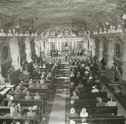 Podczas posiedzenia Senatu Uniwersytetu Wrocławskiego i Komitetu Honorowego obchodów jubileuszu 30-lecia uczelni miała miejsce uroczystość nadania tytułu doktora honoris causa Uniwersytetu Wrocławskiego prof. Henrykowi Jabłońskiemu. Tytuł został nadany na wniosek Rady Wydziału Filozoficzno-Historycznego. Aktu promocji dokonał prof. Władysław Czapliński w towarzystwie dziekana Wydziału Filozoficzno-Historycznego prof. Mariana Kulczyckiego. N/z: widok ogólny Auli Leopoldyńskiej podczas uroczystości.