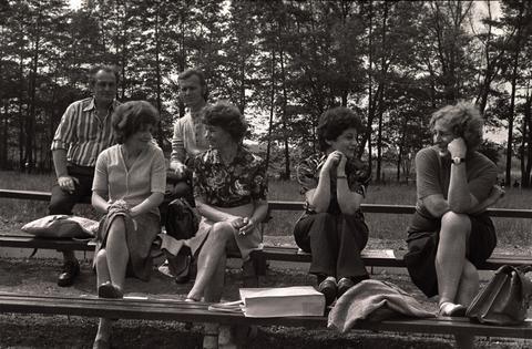 N/z grupa osób na trybunie nowego boiska Polaru.