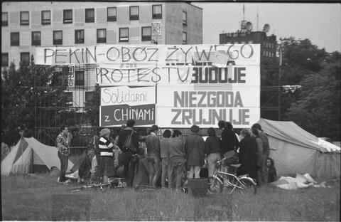 Wrocław, 09-06-1989. Wielodniowy protest (miasteczko namiotowe) zorganizowany min. przez WiP i NZS na placu Dzierżyńskiego (obecnie plac Dominikański) po krwawym stłumieniu demonstracji na placu Tian'anmen (plac Niebiańskiego Spokoju) w Pekinie 4 czerwca. Fot. NAF Dementi