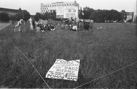 Wrocław, 09-06-1989. Wielodniowy protest (miasteczko namiotowe) zorganizowany min. przez WiP i NZS na placu Dzierżyńskiego (obecnie plac Dominikański) po krwawym stłumieniu demonstracji na placu Tian'anmen (plac Niebiańskiego Spokoju) w Pekinie 4 czerwca. Fot. NAF Dementi
