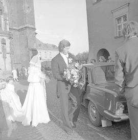 N/z para młoda z kwiatami stojąca naprzeciw wrocławskiej Katedry. Na pierwszym planie Pan młody z kwiatami. Po prawej Fiat 125P za nim budynek Papieskiego Wydziału Teologicznego.