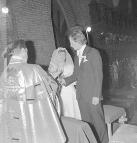 N/z para młoda stojąca naprzeciw wrocławskiej Katedry. Na pierwszym planie Pan młody z kwiatami. Po prawej Fiat 125P za nim budynek Papieskiego Wydziału Teologicznego.