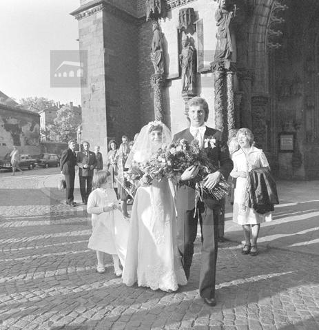 N/z para młoda z kwiatami stojąca naprzeciw wrocławskiej Katedry. Na pierwszym planie Pan młody z kwiatami. Po prawej Fiat 125P za nim budynek Papieskiego Wydziału Teologicznego.