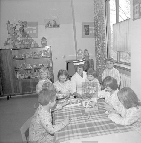 N/z pielęgniarka wraz z dziećmi w świetlicy przy stole Kliniki Chirurgii Dziecięcej Akademii Medycznej we Wrocławiu.