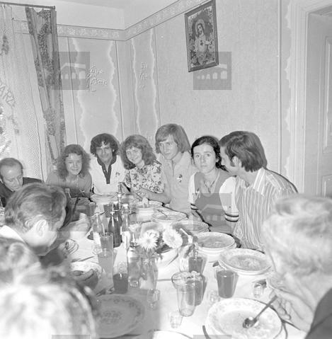 Rodzina wraz z przyjaciółmi w trakcie uroczystości ślubnych w domu, poczęstunek.
