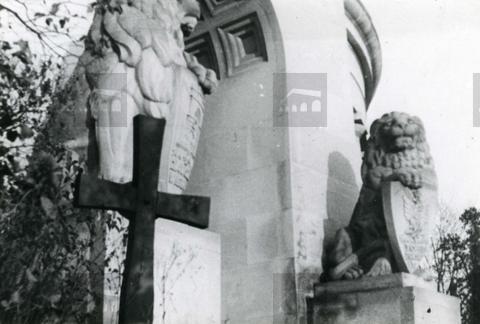 Lwy trzymające tarcze z herbem Lwowa i godłem II Rzeczpospolitej, będące częścią Pomnika Chwały [uroczyste odsłonięcie nastąpiło 11 listopada 1934 r.] na Cmentarzu Obrońców Lwowa.