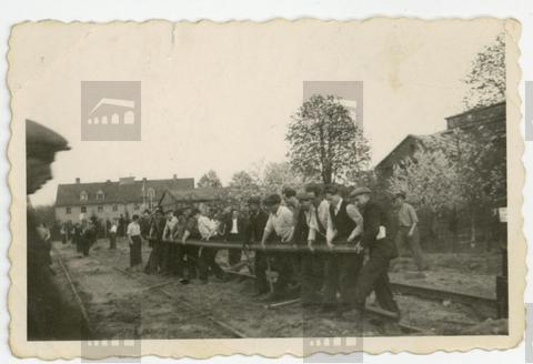 Pracownicy Komunikacji Miejskiej przy budowie torowiska pod linię tramwajową; szósty od prawej Władysław Mierzwa [przyjechał do Wrocławia w 1946r., tworzył struktury MPK w zajezdni przy ul. Słowiańskiej]