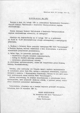 Walne Zgromadzenie Przewodniczących Komisji Zakładowych i Komitetów Założycielskich regionu wrocławskiego uchwala odwołanie strajku ostrzegawczego, w związku z porozumieniem strony rządowej ze strajkującymi w Jeleniej Górze; problemy rejestracji związku rolników indywidualnych, dostępu do środków masowego przekazu i zniesienia antystrajkowej uchwały sejmowej, jako problemy ogólnopolskie, winny być rozpatrzone przez Krajową Komisję Porozumiewawczą; nadrzędnym celem NSZZ "Solidarność" jest doprowadzenie do uchwalenia przez Sejm PRL nowej ustawy o związkach zawodowych, uwzględniającej postulaty związkowców; utrzymuje się gotowość strajkowa, uchwalona 29.01.1981
