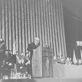 zorganizowana w Hali Ludowej uroczysta akademia z okazji 25. rocznicy kapitulacji III Rzeszy oraz przyłączenia do Polski ziem zachodnich i północnych, w której udział wzięli najważniejsi przedstawiciele władz państwowych i partyjnych; w głębi kadru przy mównicy I sekretarz Komitetu Centralnego Polskiej Zjednoczonej Partii Robotniczej Władysław Gomułka