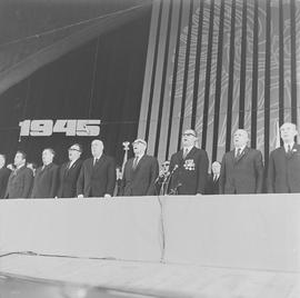 zorganizowana w Hali Ludowej uroczysta akademia z okazji 25. rocznicy kapitulacji III Rzeszy oraz przyłączenia do Polski ziem zachodnich i północnych, w której udział wzięli najważniejsi przedstawiciele władz państwowych i partyjnych; w pierwszym rzędzie od lewej: Zygmunt Moskwa (przewodniczący Centralnego Komitetu Stronnictwa Demokratycznego), Stefan Jędrychowski (minister spraw zagranicznych), Józef Tejchma (członek Biura Politycznego Komitetu Centralnego Polskiej Zjednoczonej Partii Robotniczej), Bolesław Jaszczuk (członek BP KC PZPR), Ignacy Loga-Sowiński (członek BP KC PZPR, przewodniczący Centralnej Rady Związków Zawodowych), Józef Cyrankiewicz (prezes Rady Ministrów), Władysław Gomułka (I sekretarz KC PZPR), Władysław Piłatowski (I sekretarz Komitetu Wojewódzkiego PZPR we Wrocławiu), Marian Spychalski (przewodniczący Rady Państwa), Zenon Kliszko (członek BP KC PZPR)