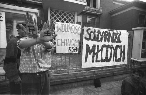 Warszawa, 06-06-1989. Wielodniowy protest pod ambasadą Chin po krwawym stłumieniu demonstracji na placu Tian'anmen (Plac Niebiańskiego Spokoju) w Pekinie 4 czerwca. Fot. NAF Dementi