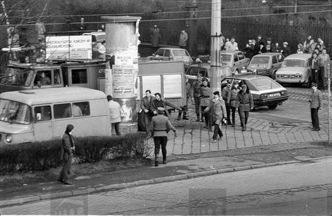 Wrocław, 17-03-1987, ul. Marii Skłodowskiej-Curie. Protest Ruchu Wolność i Pokój ws. Marka Krukowskiego zwolnionego z Akademii Medycznej we Wrocławiu za odmowę złożenia przysięgi wojskowej (studenci medycyny byli zobowiązani do złożenia przysięgi wojskowej w czasie studiów, w ramach szkolenia wojskowego). Na słupie ogłoszeniowym przed budynkiem Akademii Medycznej Wiesław Mielcarski. N/z zatrzymanie protestujących przez milicję. Fot. NAF Dementi