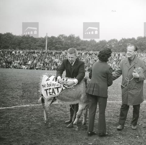 N/z Antoni Gucwiński wraz z żoną Hanną na płycie stadionu biorący udział w pochodzie, prowadzący osła z założoną płachtą "Z nim nie boimy się teatru".