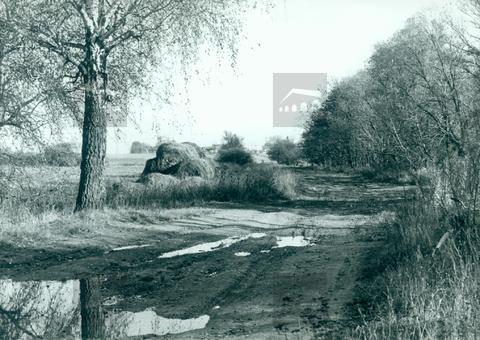droga łącząca Jankowice Małe z Psarami; na brzozie po lewej stronie drewniany krzyż [zob. F-800]; w oddali widoczne zabudowania Psar