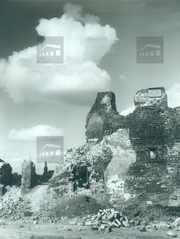 Gruzy we Wrocławiu, zniszczenia i pozostałości po II wojnie światowej. Ruiny baszty gotyckiej z XV/XVI wieku. W tle widoczny hełm wieży ratuszowej.