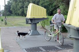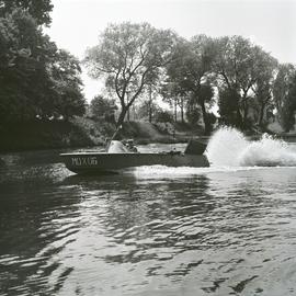 N/z uszkodzona w wyniku działań wojennych wieża elewatora w Porcie Popowice. Za budynkiem wagony na cement. Na pierwszym planie robotnik ładujący żwir.
