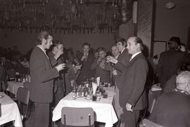 N/z spotkanie emerytów w domu kultury Polaru, przy stole widoczny dyrektor Polaru Karol Popiel, wznoszący toast. W górze baner z napisem "Szczęśliwego Nowego Roku".