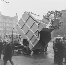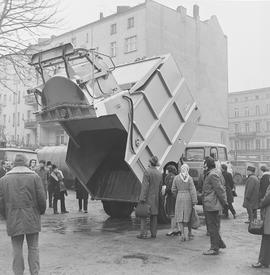 prezentacja śmieciarki francuskiej firmy Sita (zbudowanej na podwoziu samochodu marki Berliet) na terenie ówczesnego Miejskiego Przedsiębiorstwa Oczyszczania przy ul. Romualda Traugutta 72-78 (z lewej strony widoczna kamienica nr 71 przy tej ulicy)