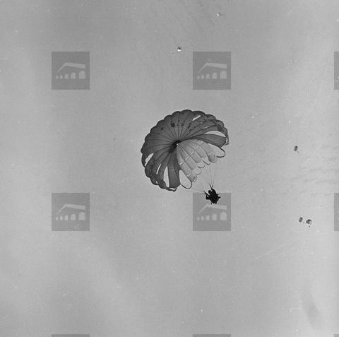 N/z spadochroniarze w locie podczas zawodów drużynowych VII międzynarodowych zawodów o "Błękitną Wstęgę Odry".