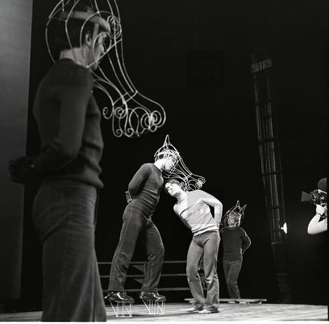 Scena zbiorowa. W centralnej części stoi Bogdan Koca (jako Alan Strang) i Andrzej Wojaczek (Koń) podczas odgrywania sztuki "Equus" Petera Shaffer.
