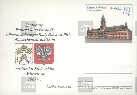 Kartka pocztowa wydana z okazji spotkania papieża Jana Pawła II z Wojciechem Jaruzelskim podczas wizyty papieża w Polsce w 1987 roku. Na kartce przedstawiono herby PRL i Państwa Watykańskiego oraz Zamek Królewski w Warszawie (znaczek).