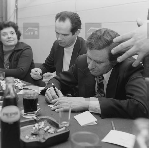 spotkanie twórców serialu telewizyjnego "Droga" - reżysera Sylwestra Chęcińskiego (drugi z lewej) i odtwórcy głównej roli Wiesława Gołasa (trzeci z lewej) - z kierowcami Państwowej Komunikacji Samochodowej we Wrocławiu