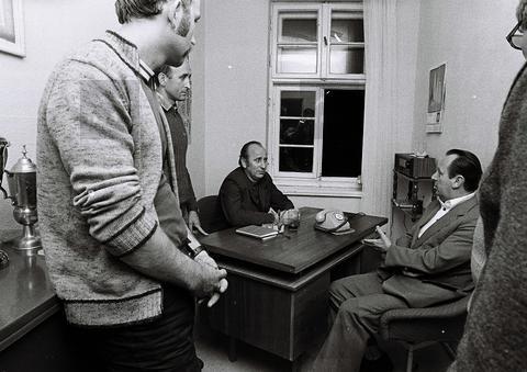 Rozmowy prezydium MKS z wojewodą Januszem Owczarkiem. Od lewej: Czesław Stawicki, Zbigniew Kopystyński, Jerzy Piórkowski i Janusz Owczarek.