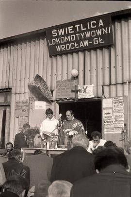Protest głodowy kolejarzy we Wrocławiu. Rozpoczął się 20 października, a zakończył w nocy między 26, a 27 paźdzernika 1980 r. . 34 osoby domagały się m. in. uznania przez ówczesne władze tworzącego się właśnie na kolei NSZZ "Solidarność", podwyżek i polepszenia warunków pracy. Na zdjęciu ksiądz Stanisław Orzechowski odprawiający mszę św.
