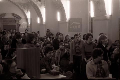 Cykl fotografii dotyczących działalności wrocławskiego NZS w latach 1980-1981. Dotyczących głównie strajków studenckich (łódzkiego i radomskiego), ale także życia na Grodzkiej (ówczesna siedziba NZS), zebrań, narad, wieców, przygotowywania i kolportowania ulotek i plakatów, koncertów i podobnych. Strajk łódzki był miedzy innymi protestem przeciwko wyrokowi sądowemu wydanemu 13 listopada 1981, nie uznającemu rejestracji NZS. Strajk radomski natomiast był strajkiem solidarnościowym, w którym uczelnie z całego kraju popierały studentów Wyższej Szkoły Inżynierskiej z Radomia. Zdjęcie wykonane w sali im. W. Nehringa.