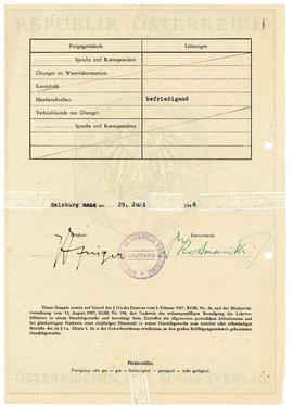 Formularz dwustronny na papierze o wymiarach 29,5 cm x 21 cm, wypełniony maszynopisem, opatrzony jedną pieczęcią okrągłą wystawiającego i dwoma podpisami odręcznymi.