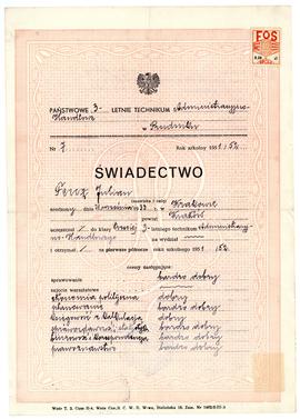 Świadectwo szkolne Juliana Fercza, ur. 21.09.1933 r. w Krakowie, w roku szkolnym 1951/1952 ucznia klasy trzeciej w Państwowym Liceum Administracyjno-Handlowym I Stopnia w Prudniku.