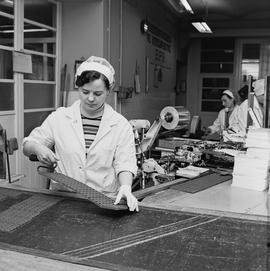 pakowanie gotowej czekolady w Dolnośląskich Zakładach Przemysłu Cukierniczego "Śnieżka" (dziś Śnieżka-Invest Sp. z o.o.) przy ul. Henryka Sienkiewicza 36 w Świebodzicach; przy pracy Krystyna Kabat (kierowniczka działu produkcji czekolady), Stanisława Mikołajczyk i Zyta Cieciuch